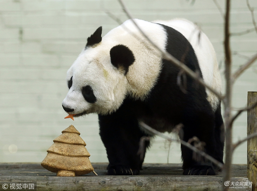 英國蘇格蘭愛丁堡,愛丁堡動物園中的大熊貓甜甜享用特制的圣誕樹形狀的蛋糕,迎接圣誕節到來。