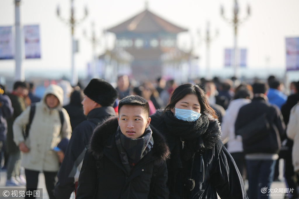 2018年12月23日,游人著厚裝在青島棧橋景區(qū)游玩。