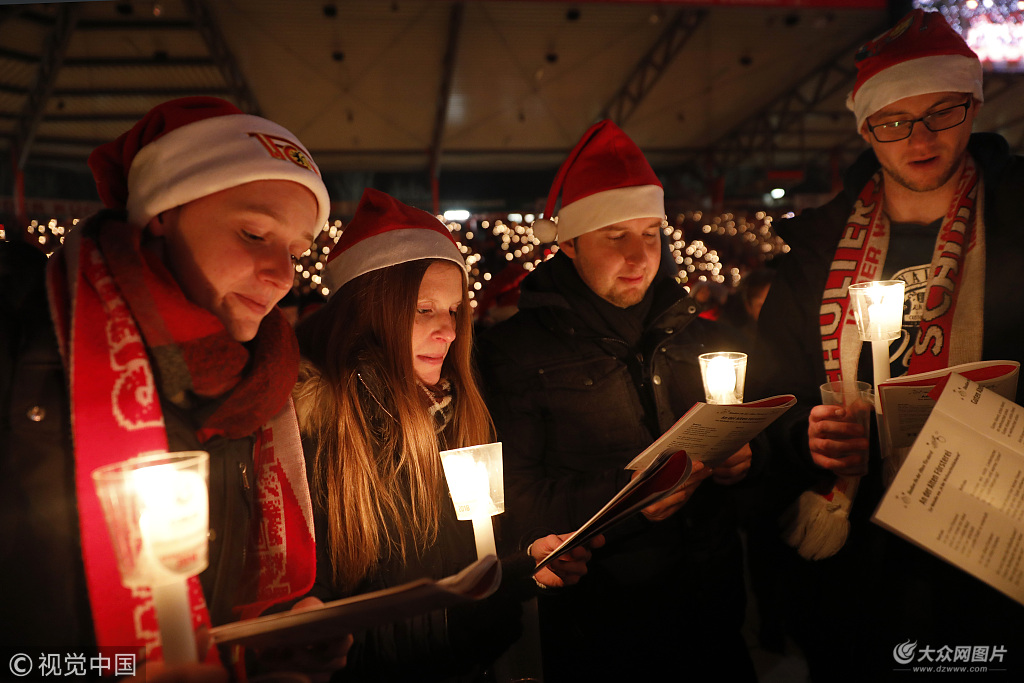 當地時間2018年12月23日,德國柏林,聯邦足球俱樂部的球迷們聚集在俱樂部體育館齊唱圣誕頌歌迎接圣誕節到來。球迷們已經連續16年舉辦一年一度的圣誕聚會,本年度的28500張票全部售出。