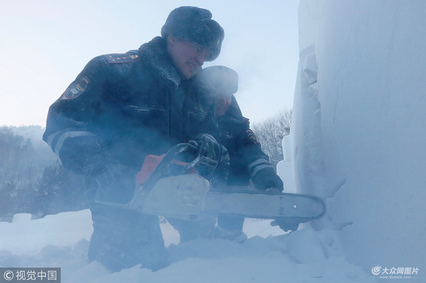 俄羅斯交警零下29度氣溫下創作雪雕 睫毛都結了冰