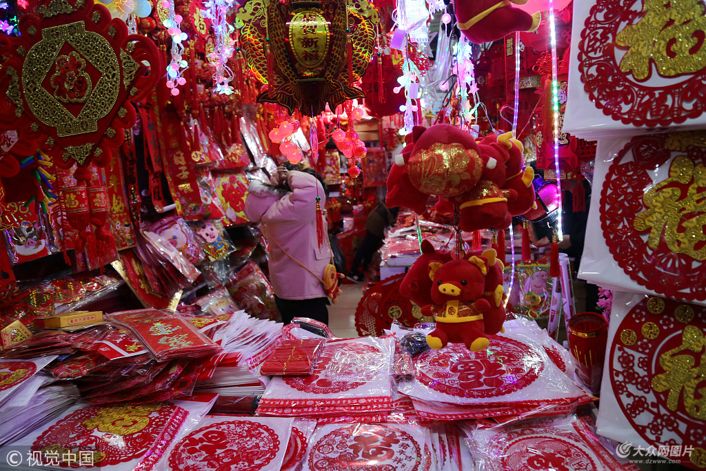 2019年1月8日,山東濟南。農歷“豬年”春節日益臨近,在濟南市場內,小豬造型的玩偶、帶有“豬”元素的年畫、春聯、燈籠、中國結、紅包等已悄然成為各飾品店、玩具店的“主角”。