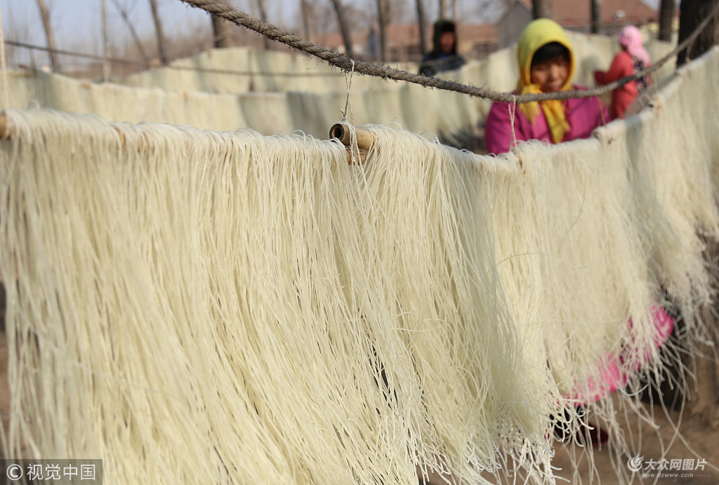 2019年1月8日,山東濱州,在博興縣店子鎮張侯村,幾名農民正在晾曬手工紅薯粉條。