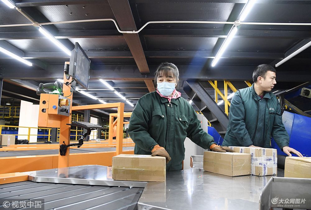 2019年1月16日,山東濟(jì)南,濟(jì)南郵區(qū)中心局雙層包裹自動(dòng)分揀機(jī)正在分揀包裹。