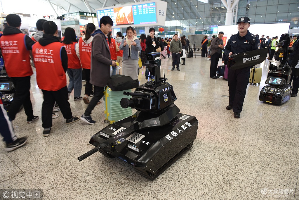 2019年1月21日,春運首日,深圳北站在候車大廳內推出機器人戰警保衛春運。