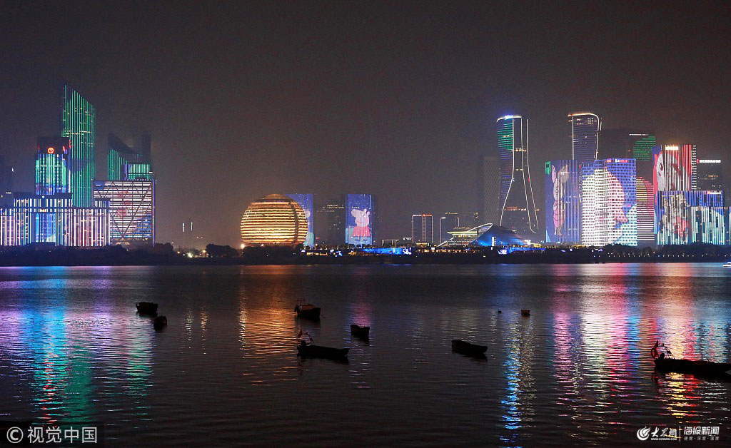 2019年2月1日晚,杭州,新年版的視覺盛宴——“金豬拱門 己亥吉祥”版賀歲燈光秀在錢江新城正式上演。