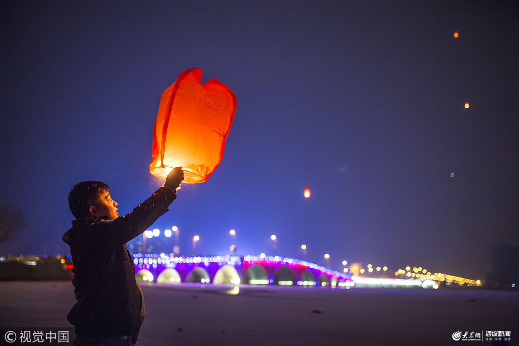 2019年2月18日,山東濱州,元宵節(jié)來(lái)臨之際,眾多市民趕往中海景區(qū),在小雪中點(diǎn)亮孔明燈,為新年祈福,放飛心愿。