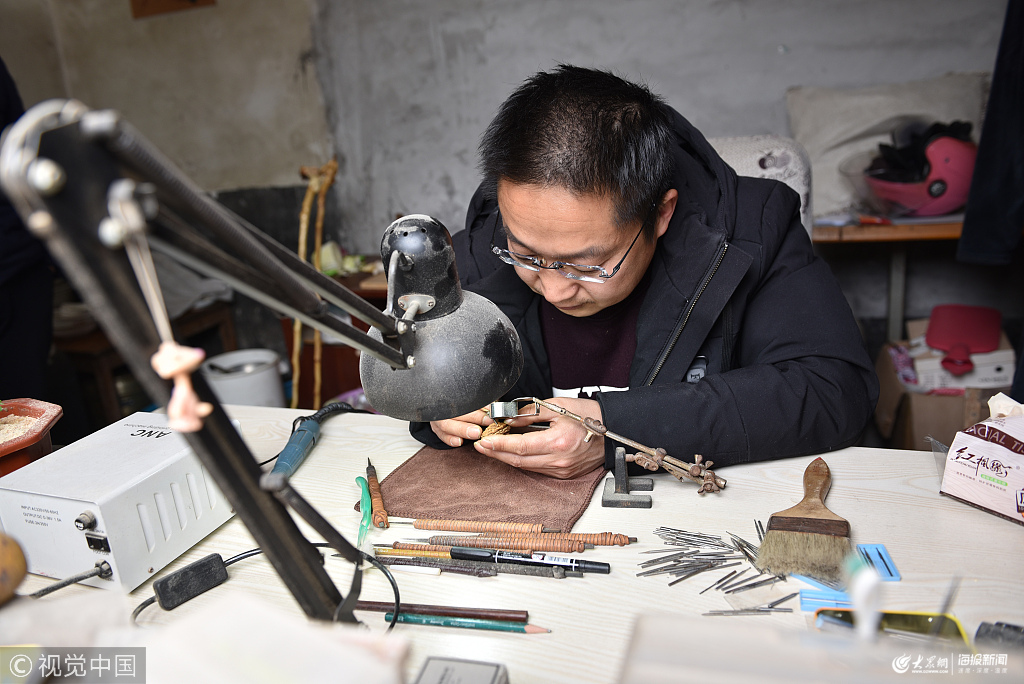 2019年2月22日,山東日照,在莒縣寨里河鎮下麻峪子村,今年41歲的李彥軍正在工作臺上雕刻作品。