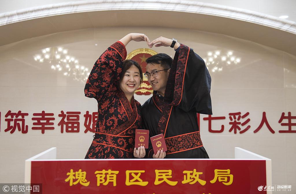 2019年3月8日,濟南,一對新人身著漢服領(lǐng)結(jié)婚證。當日,在濟南槐蔭區(qū)民政局婚姻登記處舉辦的“婚禮式頒證”儀式上,新人們身著漢服許下承諾,在父母親友的見證下喜領(lǐng)結(jié)婚證。 張勇(山東分社)/中新社/視覺中國