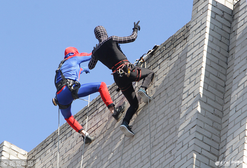 當地時間2019年3月6日,烏克蘭第聶伯羅,工人裝扮成超級英雄,在兒童醫院的天臺上從天而降透過窗戶逗樂病童們。
