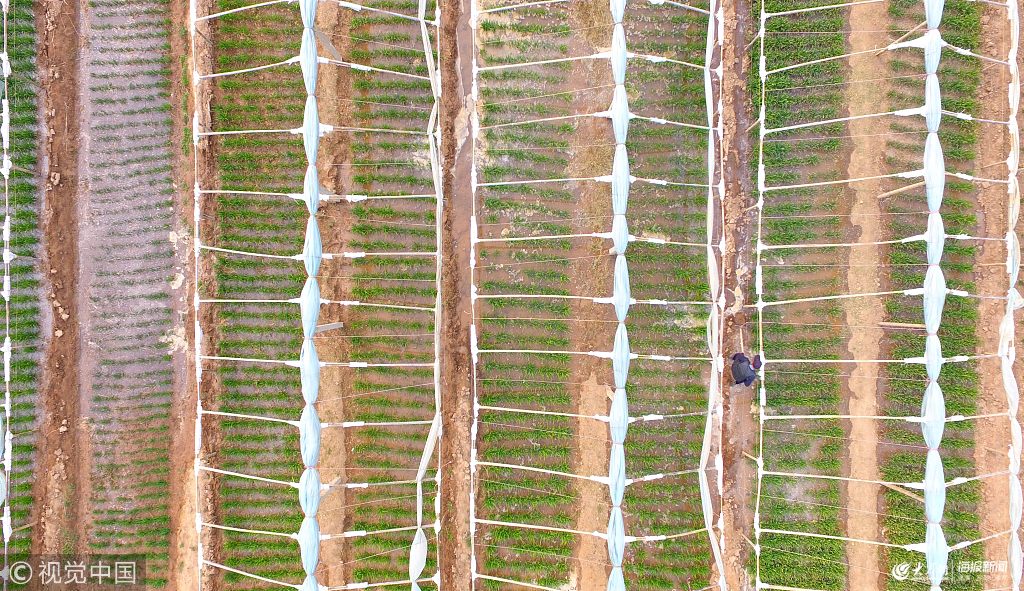 2019年3月18日,山東省聊城市茌平縣賈寨鎮后寨村的農民在田間給韭菜澆水灌溉。