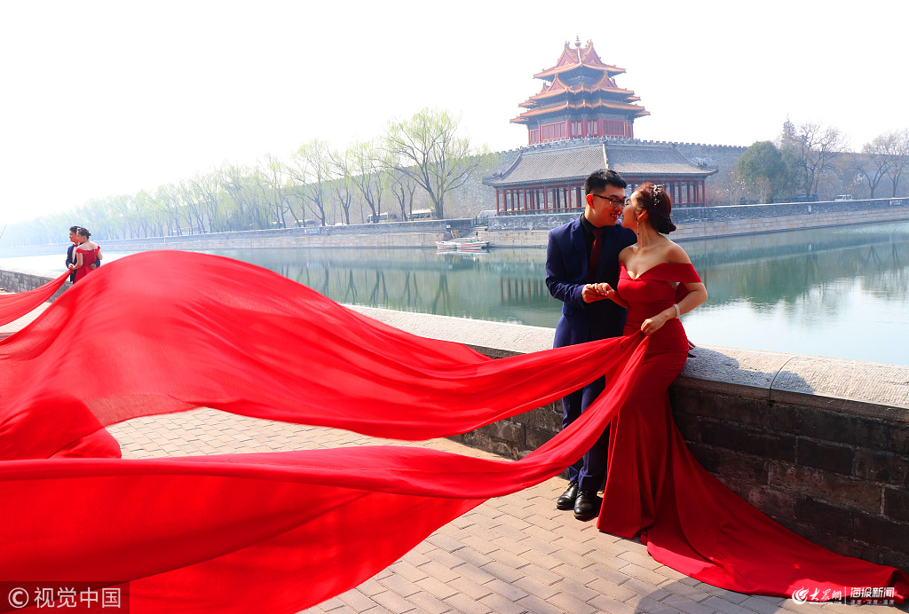 2019年3月18日,天氣暖和婚紗熱鬧起來(lái),許多年輕人來(lái)到街頭紅墻前和筒子河畔拍攝婚紗照。紅紅火火的婚紗照成為街頭一道亮麗風(fēng)景。