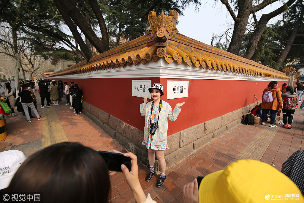 2019年4月6日,年輕人在青島市南區大學路街區“打卡”游玩。