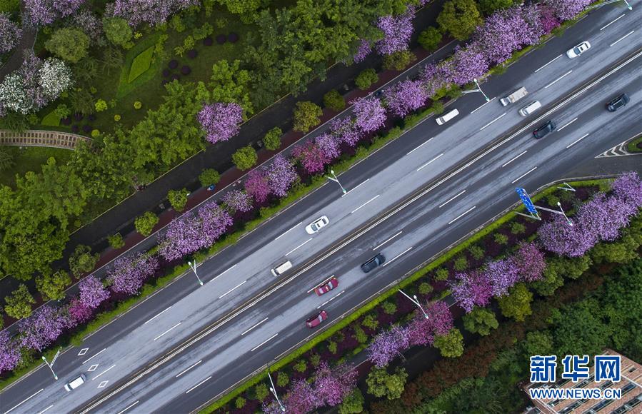 4月14日,在廣西柳州市學院路,車輛在開滿洋紫荊的街道上行駛(無人機拍攝)。 當日,一場大雨過后,廣西柳州市內(nèi)的洋紫荊開得格外嬌艷。時下,柳州市區(qū)27萬株洋紫荊進入盛花期。 新華社記者 黃孝邦 攝
