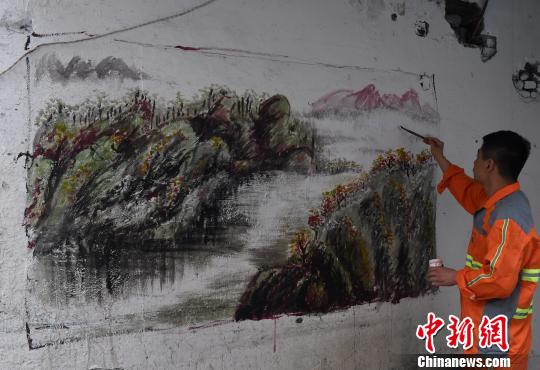 圖為重慶一名環衛工人在鏟掉“牛皮癬”的墻壁上作畫美化環境。 周毅 攝