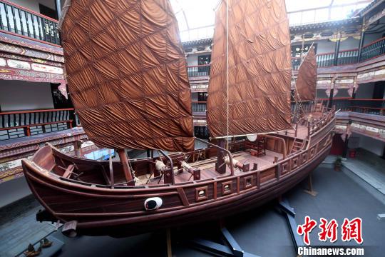 圖為博物館內一艘總長14.8米,型寬4.5米,共設有七個船艙的“趕繒戰船”。 張斌 攝