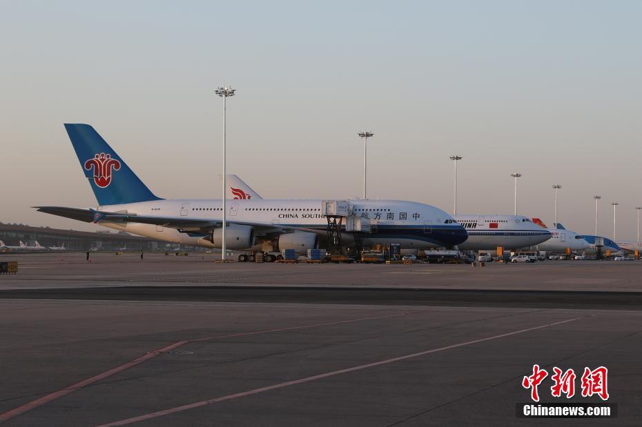 2019年5月13日清晨,北京首都機場內(nèi),即將飛赴大興機場的四架飛機。今天,北京大興國際機場開展試飛工作。參與此次試飛的航空公司為南航、東航、國航和廈航,并將分別選派A380、A350-900、B747-8、B787-9機型飛機執(zhí)行試飛任務(wù)。預(yù)計上午9點,第一架試飛飛機從首都機場起飛;約9點半,第一架飛機落地大興機場。