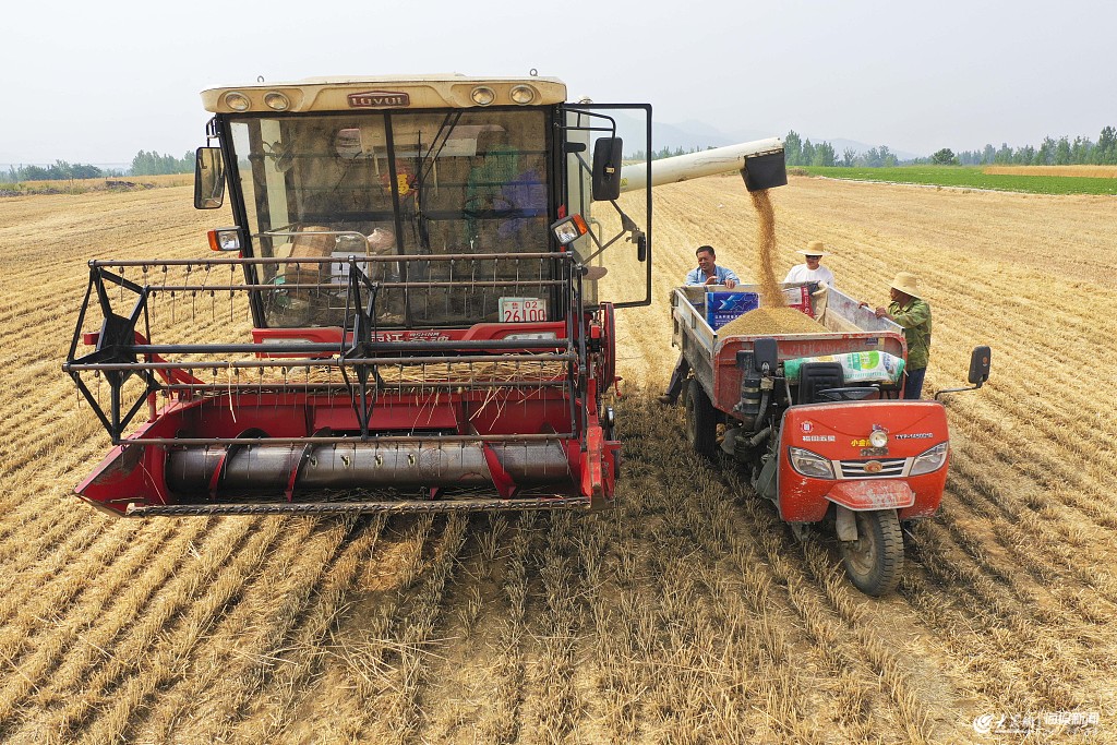 2019年6月1日,山東青島西海岸新區(qū)王臺鎮(zhèn)徐村迎來了小麥豐收季,村里的農民一大早便在麥田里用聯(lián)合收割機搶收金燦燦的小麥,確保夏糧顆粒歸倉。