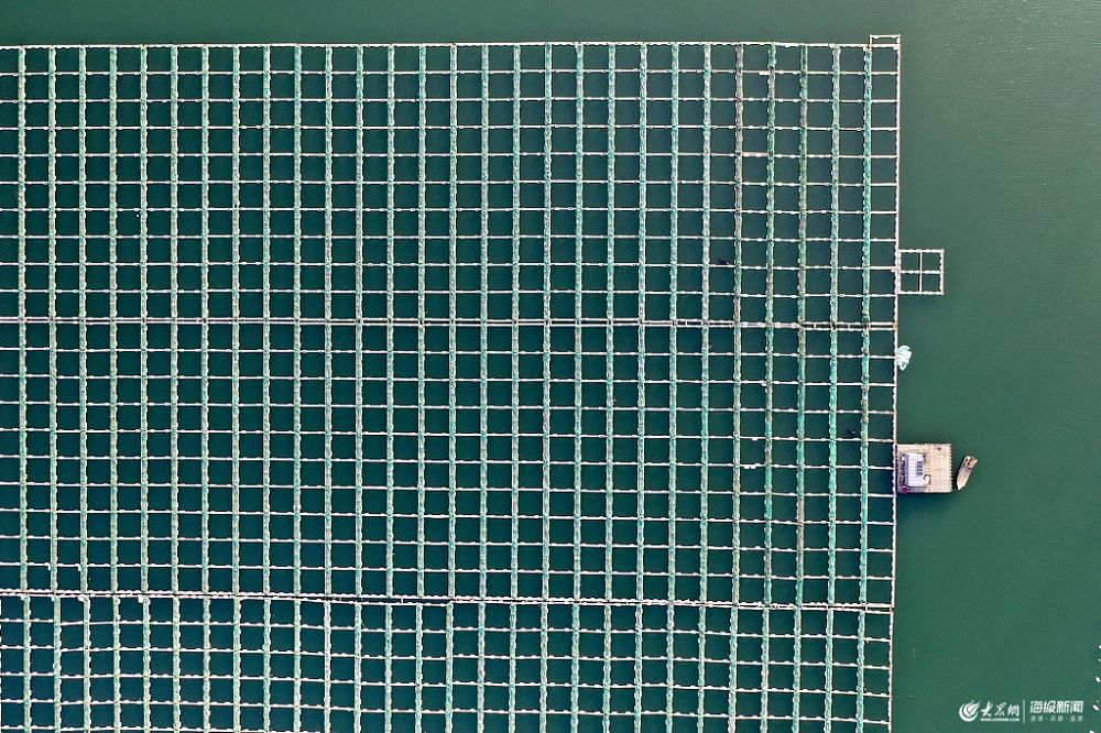 2019年6月11日,山東青島西海岸新區(qū)董家口經(jīng)濟(jì)區(qū),航拍陳家貢灣海上養(yǎng)殖場,鳥瞰如“海上糧倉”,風(fēng)景如畫。