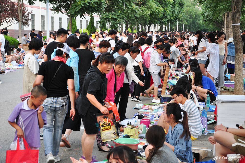 2019年6月24日,在山東德州學院校園內(nèi),大學生“攤主”紛紛在“跳蚤市場”擺攤,轉(zhuǎn)讓自己的學習資料、衣物以及生活用品等,吸引不少周邊市民和低年級學生前來“淘寶”,現(xiàn)場人氣火爆。