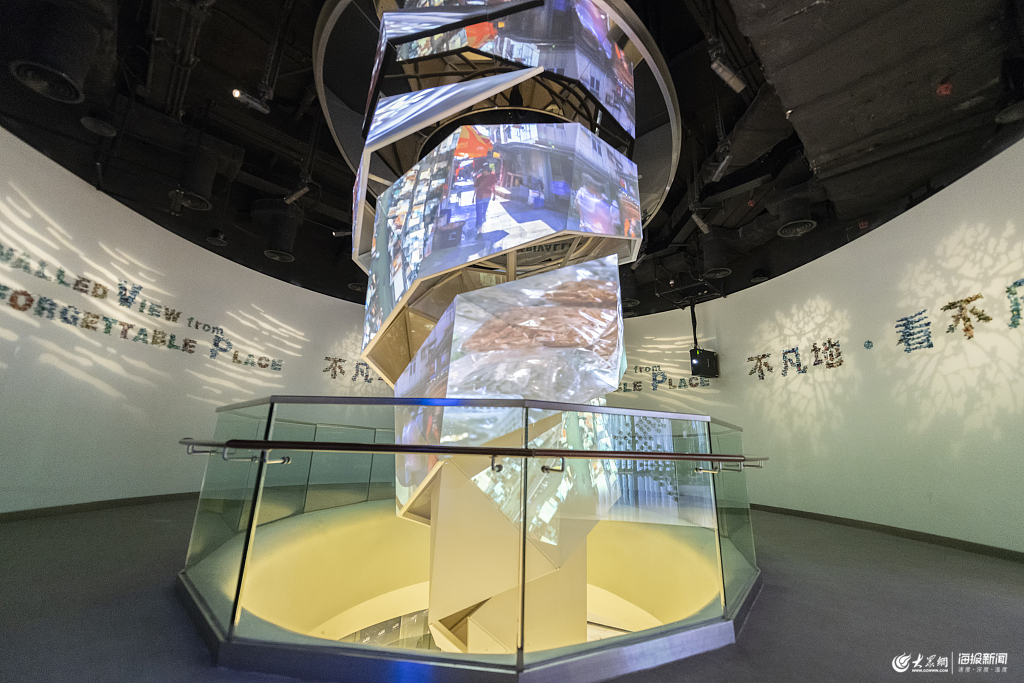 香港“天際100”觀景臺,會播放不同片段的柱子和墻。