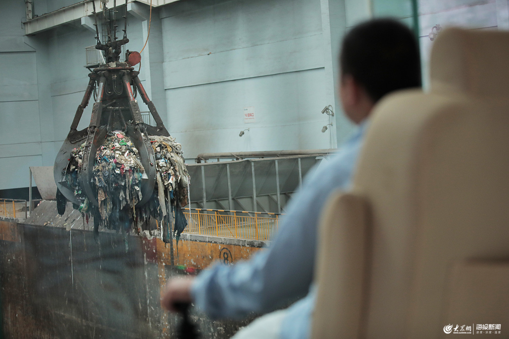 杭州,垃圾吊工作人員控制抓斗,對垃圾進(jìn)行分區(qū)堆放、投料動作。