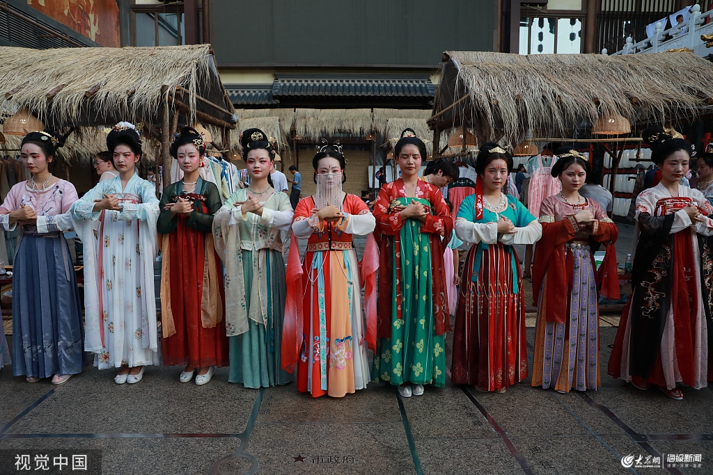 2019年7月27日,西安,在《長安十二時辰》帶火的大唐西市,一群穿著傳統漢服的青春帥男美女,冒著酷熱表演傳統禮儀和舞蹈,還乘坐電梯在唐風古韻的西市風情街悠閑逛游,恍若穿越時空。原來是這群漢服愛好者在這里開辦的“唐隱市”平臺里,以漢服這一傳統文化元素,讓更多民眾和游客了解漢服,傳承文化。