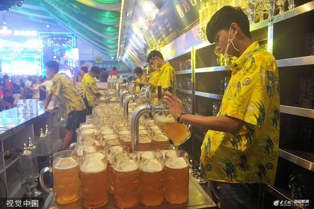 2019年7月28日,第29屆青島國際啤酒節進入第三天,越來越多的中外游客進入位于海邊的青島金沙灘啤酒城游玩、喝啤酒、狂歡,盛夏的夜晚整個海岸充滿啤酒的醇香和歡樂。