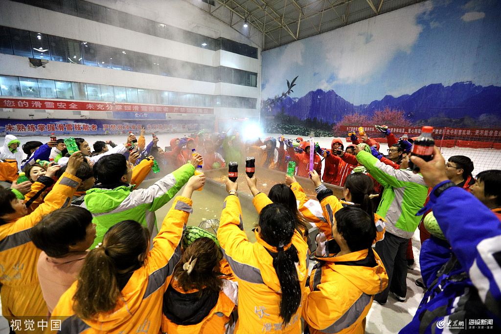 2019年8月2日晚,河南洛陽欒川伏牛山滑雪度假樂園室內館,數百職工穿著厚厚的棉衣圍著一個邊長3米的巨型火鍋在冰天雪地里涮火鍋,室外高溫炙烤,穿短袖,室內穿著棉衣吃火鍋,體驗冰火兩重天。