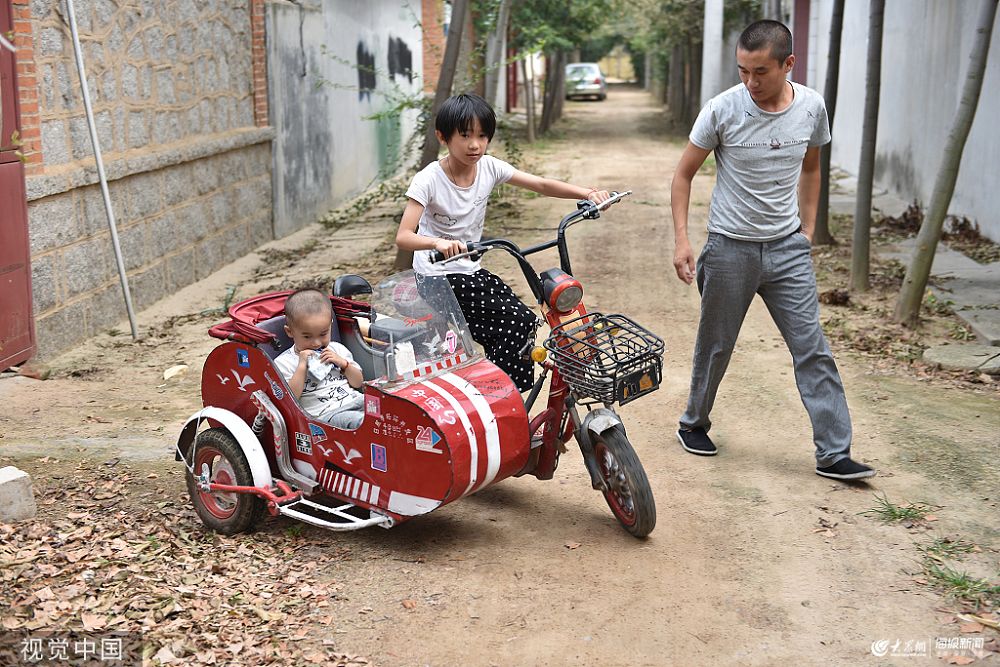 2019年8月21日,在山東省日照經濟技術開發區奎山街道西河村,村民宋成軍的女兒宋凱莉,騎著“三侉子”,拉著弟弟宋來寶在街上玩耍,看上去非常炫酷“拉風”。這輛“三侉子”是宋成軍利用兩天時間,純手工打造而成。除去二輪電動車不算價格的話,“偏三”車斗的材料和人費在600元左右。
