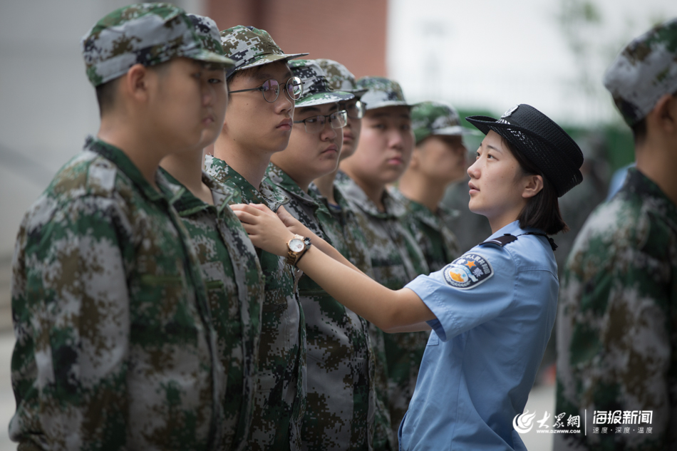 開學季軍訓,教官正在為軍訓學員整理衣服
