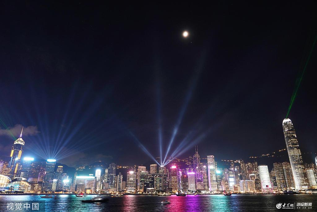 2019年9月6日晚,難得一見的“木星合月”天象出現在香港維多利亞港的西南方天空,與正在上演的“幻彩詠香江”燈光秀構成難得一見的景觀。