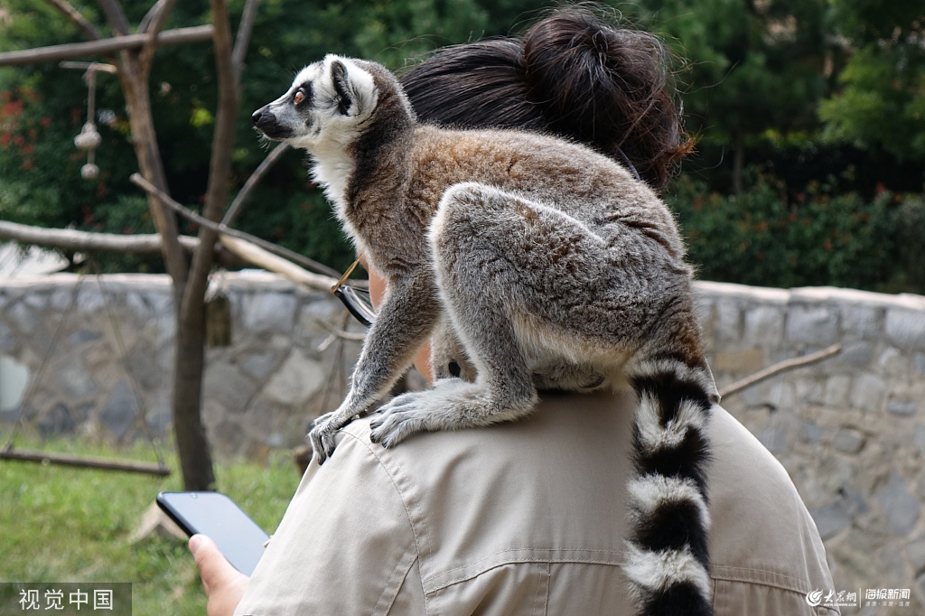 2019年9月6日,山東青島森林野生動物世界,環尾狐猴與游客零距離接觸,場面溫馨,諧趣橫生,令人忍俊不禁。