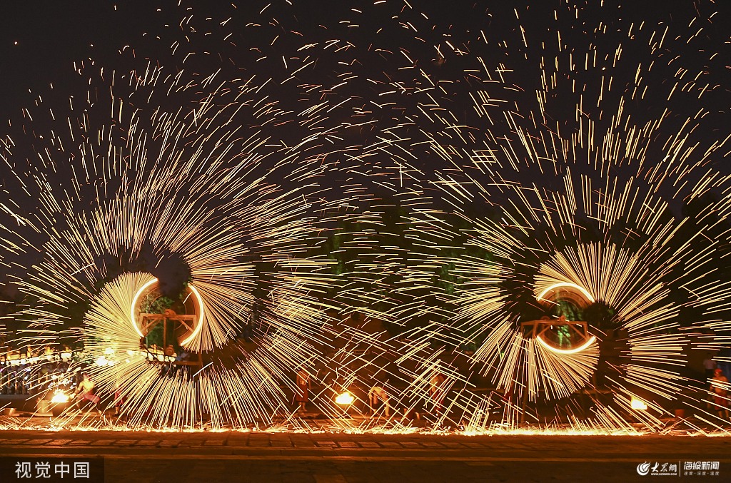 2019年9月13日晚,民間藝人在山東臺兒莊古城景區(qū)進(jìn)行火龍鋼花表演。