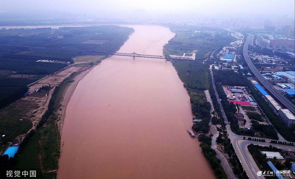 2019年9月17日,航拍黃河濟南段,洶涌的河水猶如野馬奔騰,河岸的沙土不斷被洪水沖倒,河水基本滿了河槽。