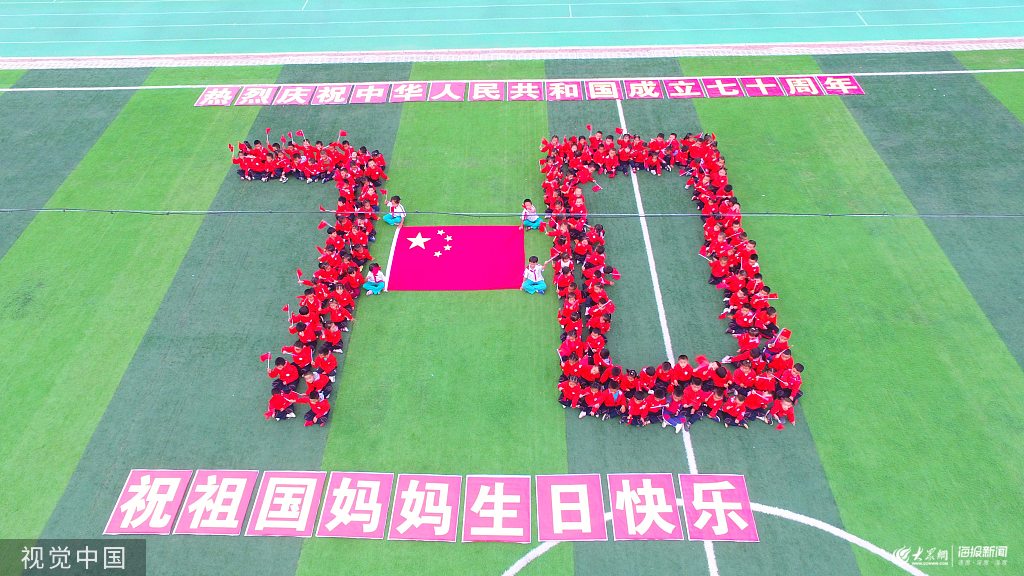 2019年9月20日,在山東省聊城市茌平區菜屯鎮中心幼兒園,小朋友們手拿國旗組成“70”字樣,慶祝新中國成立70周年。(無人機拍攝)