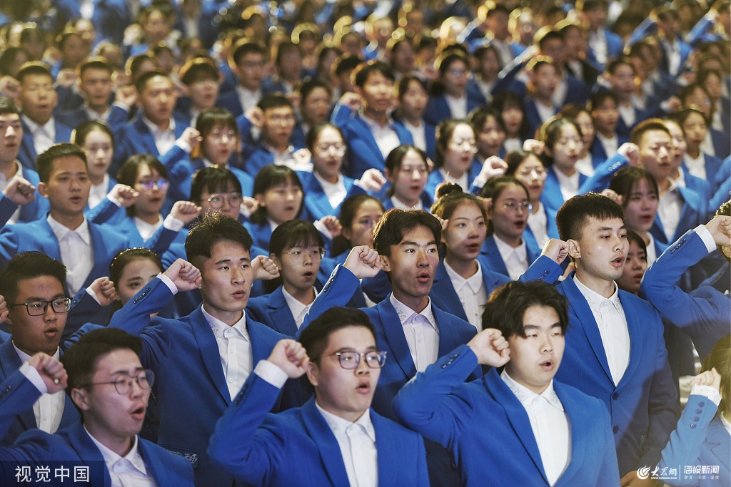 2019年10月13日,浙江嘉興,第六屆世界互聯網大會志愿者在浙江桐鄉技師學院舉行出征儀式,1000名“小梧桐”宣誓呼號。儀式上還發布及展示了志愿者服裝、志愿匯智能指揮系統。