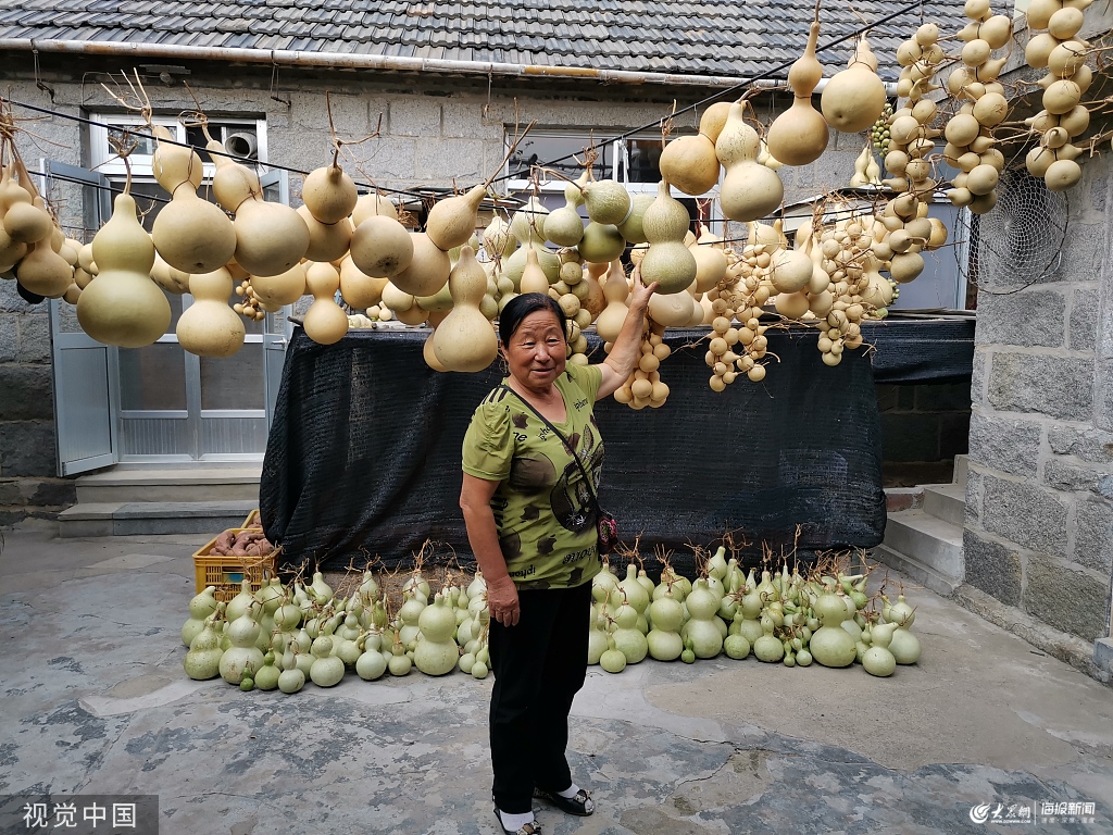 2019年10月24日,山東威海,文登區(qū)界石鎮(zhèn)有個(gè)梧桐庵村,據(jù)村志記載于姓家族清朝中期遷居至此,整個(gè)村落群山懷抱之中景色宜人如今被評(píng)為美麗鄉(xiāng)村示范村,每年超30萬的游客讓66歲的王玲滋看到了商機(jī)。在她手中往年摘下來沒人要的葫蘆,在葫蘆上畫畫,葫蘆畫受到游客歡迎。
