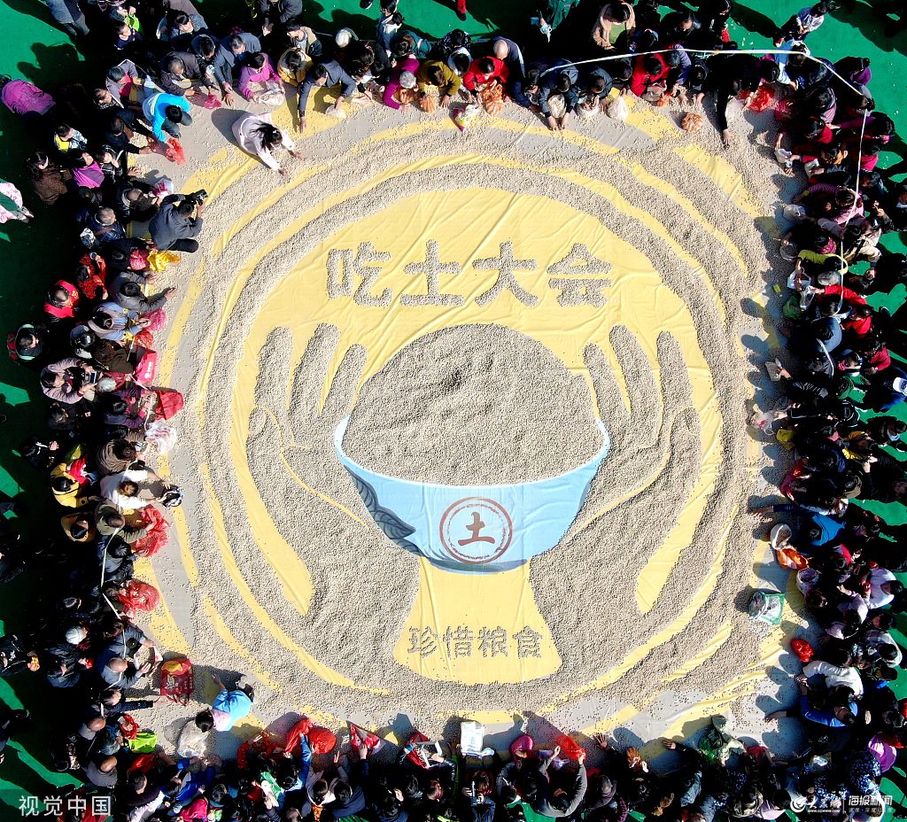 2019年10月26日,河南濟源舉辦王屋山全民“吃土大會”,近萬斤當地獨有的土饃擺成手捧巨碗的畫面。圖片作者:DF/視覺中國
