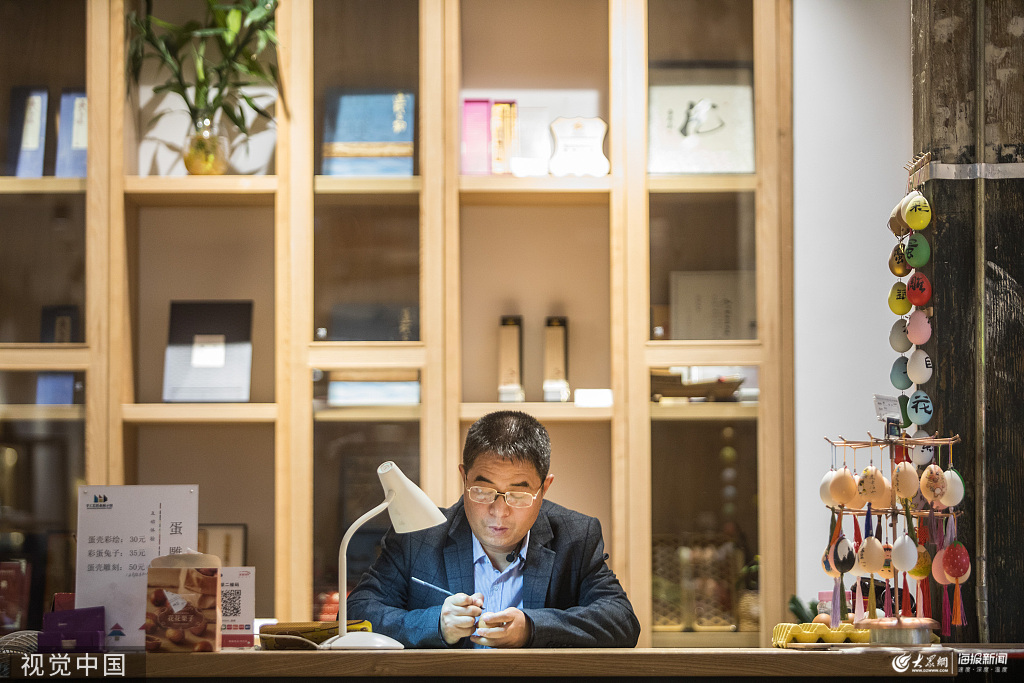 手工藝活態(tài)館平時(shí)人雖不多,但來(lái)的人大多會(huì)被董一言的作品吸引,有些游客還會(huì)模仿著蛋殼上的畫(huà)像擺起造型。