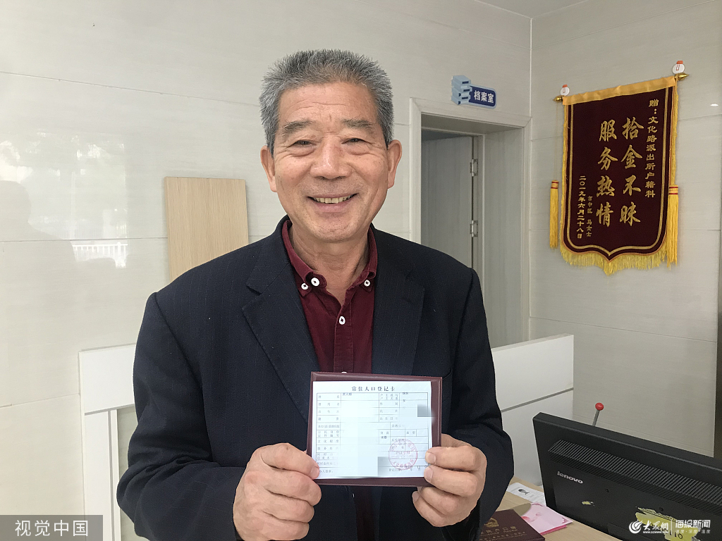 2019年11月1日,山東棗莊,黃維平的妻子已經67歲,因為高齡產子而成為全國關注的焦點。圖為老人黃維平到派出所給女兒辦戶口。