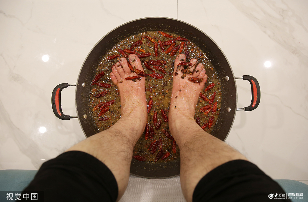 2019年11月16日,重慶渝中區,一家足浴店推出一款“老重慶火鍋足道”套餐,用鐵鍋泡腳,材料是火鍋底料!這個創意來自95后姬美伶,她說,自己在國外讀書時發現火鍋在國外很火,但是大家卻都不知道火鍋底料還很養生,于是在2018年開了這家店。她店中的火鍋底料有23味中藥材和紅酒、醋等材料。