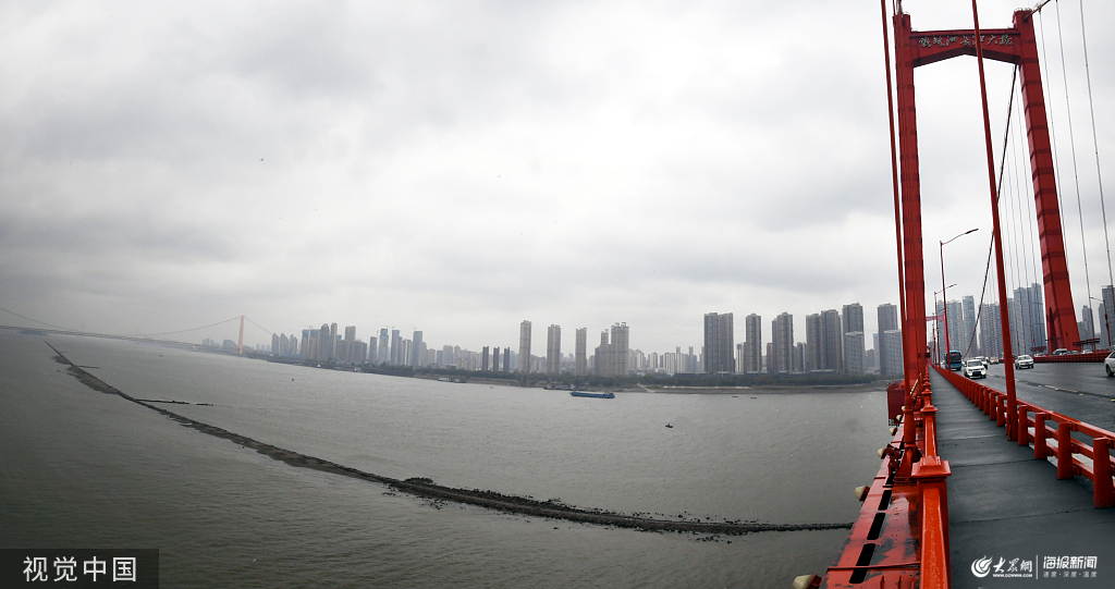 長江武漢段鸚鵡洲長江大橋中間橋墩處,從長江下游往上游方向,江面中心出現了一條細長“道路”。