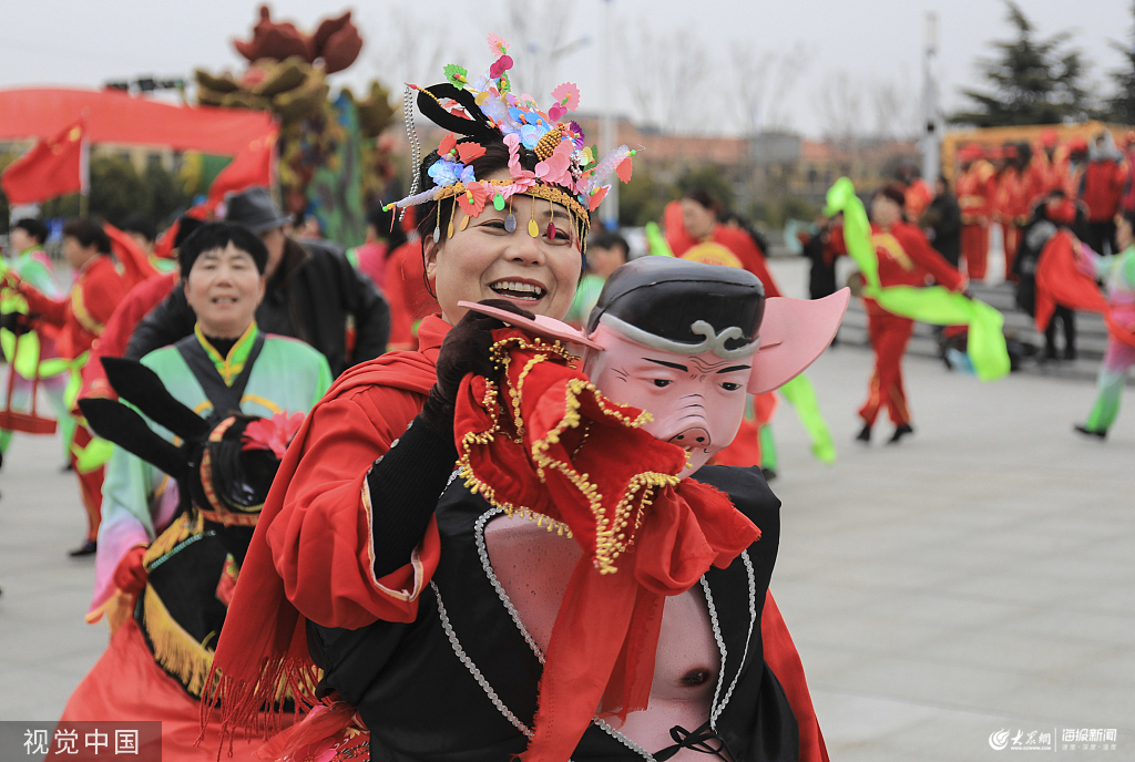2019年2月8日,山東臨沂,居民在國際海棠藝術中心進行傳統秧歌表演。
