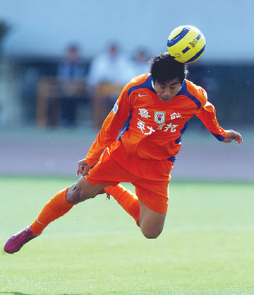 4月19日,山東魯能隊(duì)球員韓鵬在比賽中頭球攻門(mén)。當(dāng)日,在中國(guó)足球超級(jí)聯(lián)賽第八輪比賽中,山東魯能隊(duì)主場(chǎng)以5∶1戰(zhàn)勝西安國(guó)際隊(duì)。