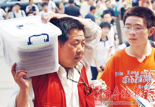 12日下午,記者在省實驗中學、濟南中學、回民中學等考點看到,考生們入場時都是大包小包齊上陣。在省實驗中學門口,一位王女士幫女兒提著3個手提袋,里面裝滿了政治、地理、歷史的教科書和輔導材料。王女士說,這還沒有帶全呢。這樣在考場上心里有點底。還有的考生甚至動用了拉桿箱和大大的密碼箱,里面裝的全是相關書籍。有的家長幫孩子把考試用書扛到了考場。