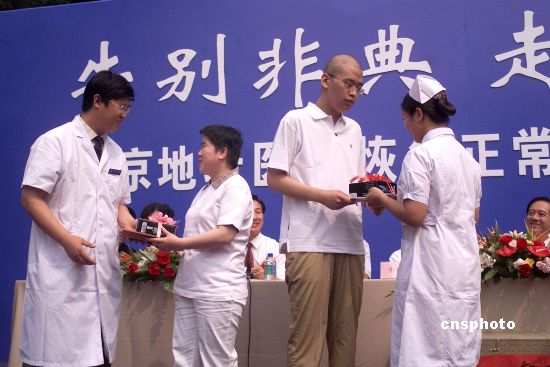 2003年8月16日上午,中國內(nèi)地最后一批非典合并癥患者結(jié)束了在北京地壇醫(yī)院的治療,康復(fù)出院回歸社會。同日,北京地壇醫(yī)院恢復(fù)了正常門診、病房工作。上午9點30分,地壇醫(yī)院舉行了“告別非典,走向明天”歡送最后一批非典合并癥患者的出院儀式。6月24日,世界衛(wèi)生組織宣布北京“雙解除”后,北京地壇醫(yī)院成為全市唯一保留的非典定點醫(yī)院。有20多位患有合并癥的病人陸續(xù)轉(zhuǎn)入地壇醫(yī)院。經(jīng)過醫(yī)護人員的精心治療,已全部康復(fù)出院。中新社資料圖 趙晶 攝