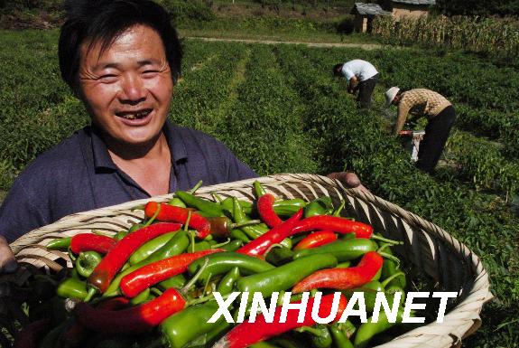 資料圖片:9月19日,貴州龍里縣雞場村菜農(nóng)陳德華在政府幫扶下種植的菜田內(nèi)收獲辣椒。得益于中央和地方的各種支農(nóng)惠農(nóng)政策及農(nóng)民致富觀念的轉(zhuǎn)變,2007年上半年貴州省農(nóng)民現(xiàn)金收入增長迅速,人均收入達到1045元,實際增長13.8%,同比增長6.6個百分點,創(chuàng)近年來的新高。新華社記者 楊俊江 攝