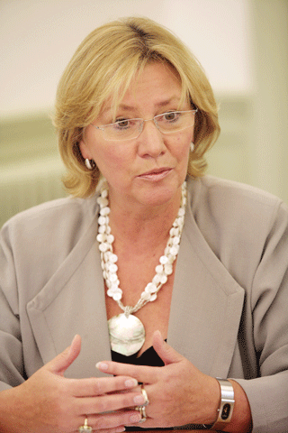 在龍比亞大學的校長辦公室,記者見到了這位異域的“山東省榮譽公民”。瓊·斯特林格教授——一位從容、優雅而豐韻的中年女士。她一頭金色的短發,一件飄逸的灰色外衣,一圈象牙白的貝殼項鏈,臉上帶著優雅的微笑。