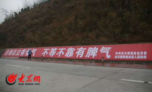 大眾網北川1月27日訊 通往北川縣城的公路上隨處可見大幅的標語,鼓舞著北川人民重建家園,感恩社會,感恩山東人民。圖為北川馬路邊鼓舞士氣的口號“自強自立有骨氣 不等不靠有脾氣(有脾氣:有志氣的意思)
