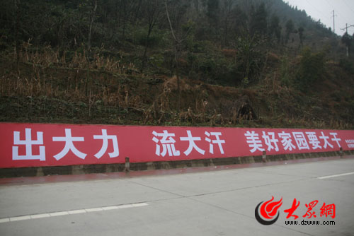 北川馬路邊鼓舞士氣口號“出大力 流大汗 美好家園要大干”。